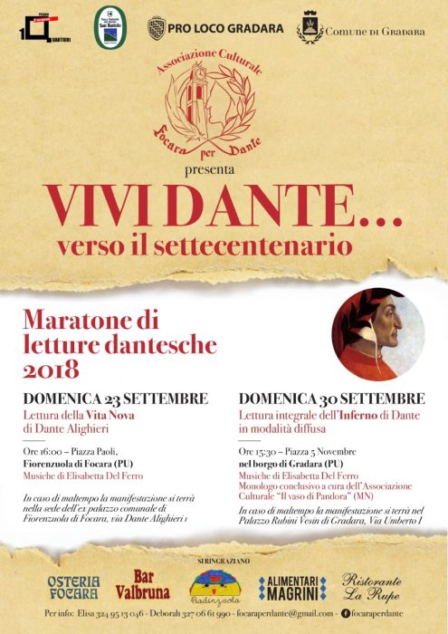 Tutta la macchina organizzativa si trasferirà poi la domenica successiva, 30 settembre, a Gradara, dove è in programma il secondo appuntamento della kermesse. Cambierà leggermente il format ma non la ragione culturale alla guida dell’evento: sarà una maratona di lettura sparsa con tante postazioni che ricopriranno il suolo del borgo e lo riempiranno delle celebrate note dell’Inferno.