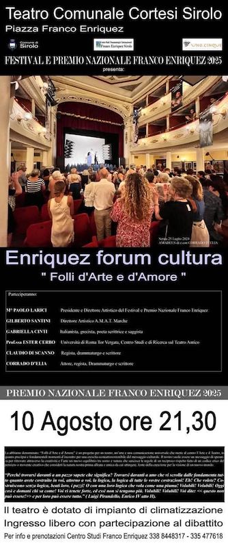 SIROLO (AN) – Domenica 10 agosto 2025, presso il Teatro Cortesi, in Piazza Franco Enriquez, 4, a Sirolo, alle ore 21.30, si terrà il Forum “Enriquez. Folli d’arte e d’amore”, evento organizzato dal Centro Studi Franco Enriquez, con il patrocinio del Comune di Sirolo.