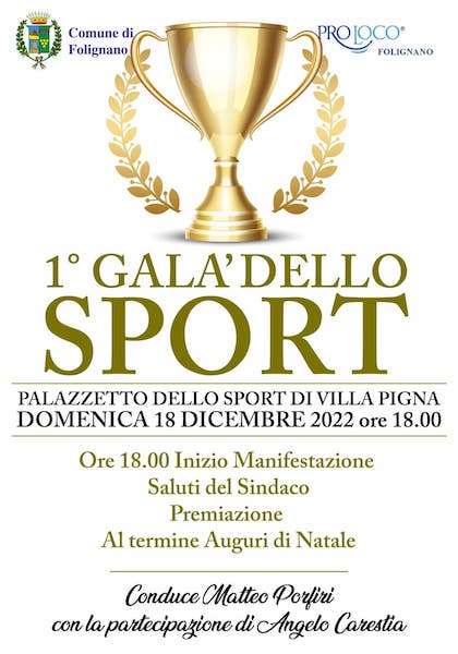 FOLIGNANO (AP) – Domenica 18 dicembre 2022, alle ore 18.00, presso il PalaRozzi di Villa Pigna si terrà la prima edizione del “Galà dello sport” di Folignano, la manifestazione nata dalla collaborazione dell’amministrazione comunale con le società sportive del territorio e la Pro Loco. La serata sarà condotta da Matteo Porfiri e animata da Angelo Carestia. Saranno premiate le eccellenze nel mondo dello sport per l’annata 2021. Ma ci sarà spazio anche per il ricordo: due premi saranno consegnati in memoria di Pierluigi Federici e Emidio Chiappini.