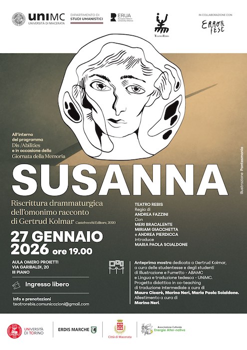 In scena, Susanna è interpretata da Miriam Giacchetta, giovane attrice che ha sviluppato nei laboratori teatrali di Unimc la passione per la recitazione per poi diplomarsi all’Accademia per attori del Teatro Bellini di Napoli. Meri Bracalente e Andrea Pierdicca, del Teatro Rebis, daranno voce agli altri personaggi del racconto. Lo spettacolo sarà introdotto da Maria Paola Scialdone, professoressa di letteratura e cultura tedesca di Unimc, che con saggi e traduzioni ha contribuito in modo significativo alla diffusione dell’opera di Gertrud Kolmar in Italia.