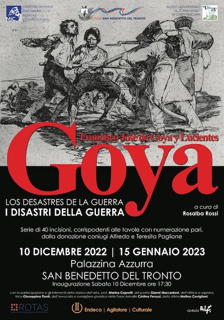 SAN BENEDETTO DEL TRONTO (AP) – Dal 10 Dicembre 2022 al 15 Gennaio 2023, presso la Palazzina Azzurra di San Benedetto del Tronto è visitabile la mostra “Goya – Los Desastres de la Guerra”, che rientra nell’ambito della programmazione natalizia 2022 del Comune di San Benedetto del Tronto.L’evento, a cura della dott. Rosalba Rossi, promosso da Endeca Agitatore Culturale dell’arch. Franco Mercuri, è patrocinato dal Comune di San Benedetto del Tronto e dal Museo Universitario “G. D’Annunzio” di Chieti-Pescara, diretto dal Prof. Luigi Capasso.