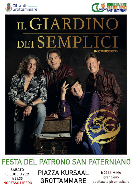 GROTTAMMARE – Da venerdì 12 a domenica 14 luglio 2024 si svolgerà la festa di S. Paterniano, patrono di Grottammare. Momento clou dell’evento sono i fantastici fuochi pirotecnici, evento che incanta da sempre le migliaia di persone presenti in Piazza Kursaal e sulla spiaggia del paese rivierasco, previsti quest’anno sabato 13 luglio dalle ore 23.45 circa, ovvero subito dopo la conclusione del concerto della mitica band napoletana “Il Giardino dei Semplici” che ha scelto la città di Grottammare per festeggiare i 50 anni di carriera, con tutti i successi come “Miele”, “M’innamorai”, “Concerto in la minore”, “Tu ca Nun chiagne”, “Vai”, “Una storia”, “Angela”, “Tamburino”, oltre a “Grande Amore” canzone del 2015 de “Il Volo”, scritta da Tommy Esposito batterista de “Il Giardino dei semplici”. Questi i loro pezzi di maggiore risonanza, insieme a tanti altri brani che proporranno durante la serata di grandi festeggiamenti per tutta Grottammare e non solo, grazie a questa band che ha spopolato negli anni ‘70/’80 e che porterà sul palco un medley pazzesco, seppur molto compatto, pur di far rivivere al pubblico grandi emozioni in un due ore di concerto tutto da gustare.