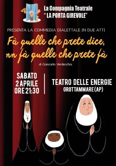 Sabato 2 aprile ultimo appuntamento per la prima parte di questa rassegna, che tornerà con altre date in autunno, con la compagnia di Alba Adriatica “LA PORTA GIREVOLE” che porterà in scena la commedia “FA’ QUELLO CHE PRETE DICE, NON FA’ QUELLO CHE PRETE FA’ ”.