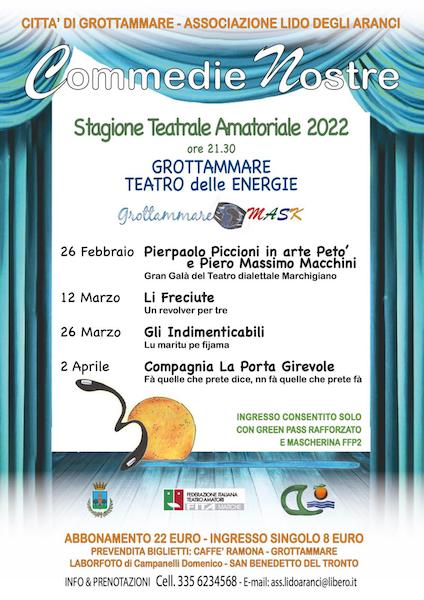 GROTTAMMARE – Sabato 26 Febbraio 2022, al Teatro delle Energie di Grottammare, alle ore 21.30, si alza il sipario per la rassegna di Teatro Amatoriale “Commedie Nostre” edizione 2022.