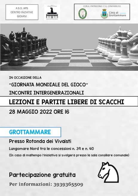 Asd Aps Centro Iniziative Giovani, con il patrocinio e il contributo del Consiglio Regionale – Assemblea Legislativa delle Marche e Comune di Grottammare, organizza per sabato 28 maggio a partire dalle ore 16, una serie di lezioni e partite libere di scacchi che si svolgeranno presso la Rotonda dei vivaisti, lungomare Nord (tra le concessioni n. 39 e n. 40).