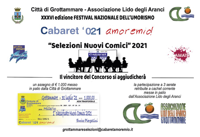 GROTTAMMARE – Sono già arrivate le prime adesioni alle “Selezioni Nuovi Comici” per la 36a edizione del Festival Nazionale dell’Umorismo CABARET Amore mio!” edizione 2021 di Grottammare e tante altre ne arriveranno. Questo fa ben sperare e ci fa credere ancora di più in questo progetto che, di durata ormai più che trentennale, ha visto sempre la piena collaborazione tra la Associazione Lido degli Aranci e l’Amministrazione Comunale di Grottammare, con a capo il Sindaco Enrico Piergallini. Concorso che premia i nuovi talenti che si affacciano al mondo dello spettacolo e dell’intrattenimento, fiore all’occhiello per la nostra cittadina, conosciuta e riconosciuta come autrice del più longevo festival del Cabaret su tutto il territorio nazionale. In questo momento particolare che tutti stiamo affrontando, che vede il settore artistico in profonda crisi, la Associazione Lido degli Aranci vuole garantire 3 serate di spettacolo al vincitore del Festival, affiancata dall’Amministrazione Comunale che invece offre un premio in denaro di ben mille euro.