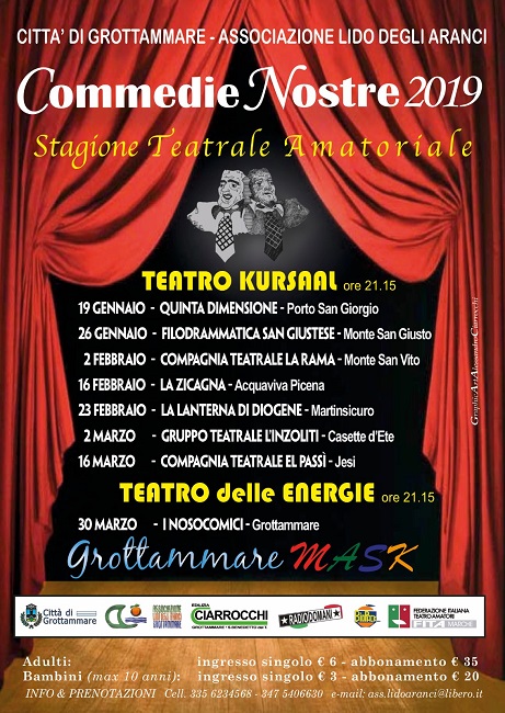 GROTTAMMARE – Sesto appuntamento per la fortunata rassegna Commedie Nostre, kermesse di teatro amatoriale in scena al Kursaal di Grottammare.