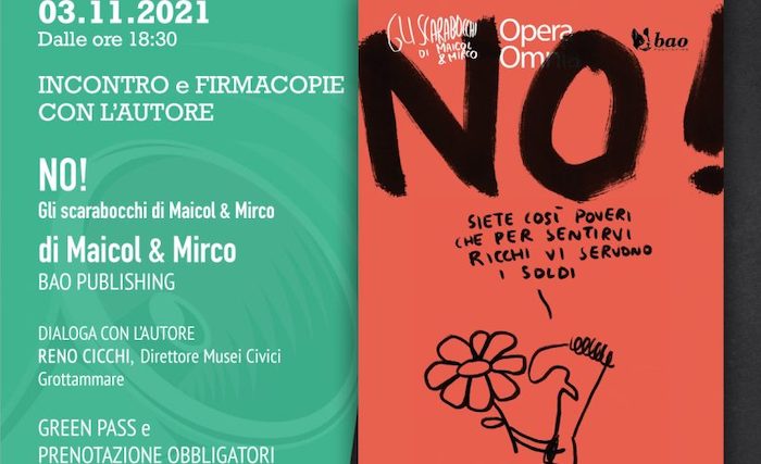 GROTTAMMARE – Mercoledì 3 novembre 2021, alle ore 18.30 presso L’Ospitale, Casa delle Associazioni, Sala Cineforum in via Palmaroli 19 al vecchio incasato di Grottammare, si terrà la presentazione di “NO! Gli Scarabocchi di Maicol&Mirco” di Maicol & Mirco, Bao Publishing. Dialogherà con l’autore Reno Cicchi, direttore Musei Civici Grottammare.