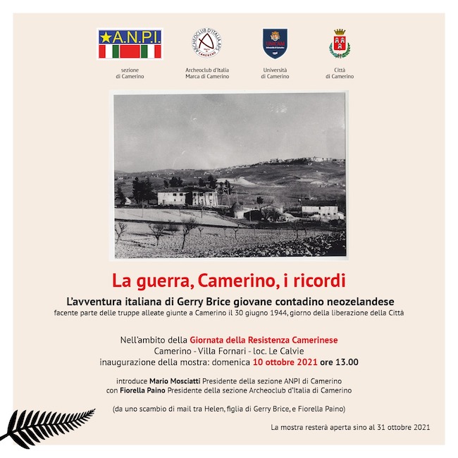 CAMERINO – Resterà aperta fino a domenica 31 ottobre, la mostra dal titolo “La guerra, Camerino, i ricordi”. L’avventura italiana di Gerry Brice giovane contadino neozelandese, facente parte delle truppe alleate, che ha trascorso un periodo a Camerino nel 1944.