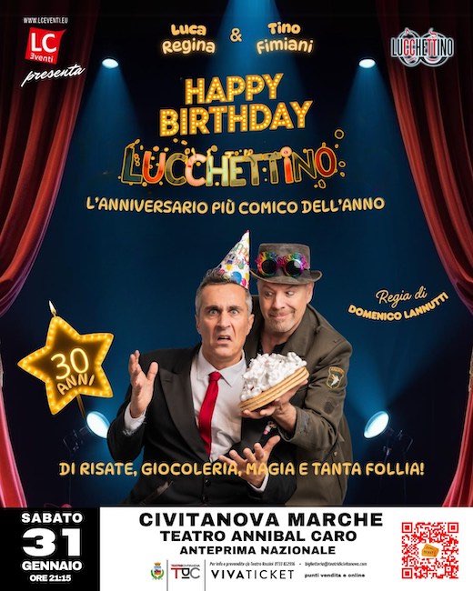 CIVITANOVA MARCHE – Sabato 31 gennaio 2026, alle ore 21.15, al Teatro Annibal Caro di Civitanova Marche, andrà in scena Happy Birthday Lucchettino, con Luca Regina e Tino Fimiani, il celebre duo comico conosciuto come I Lucchettino.