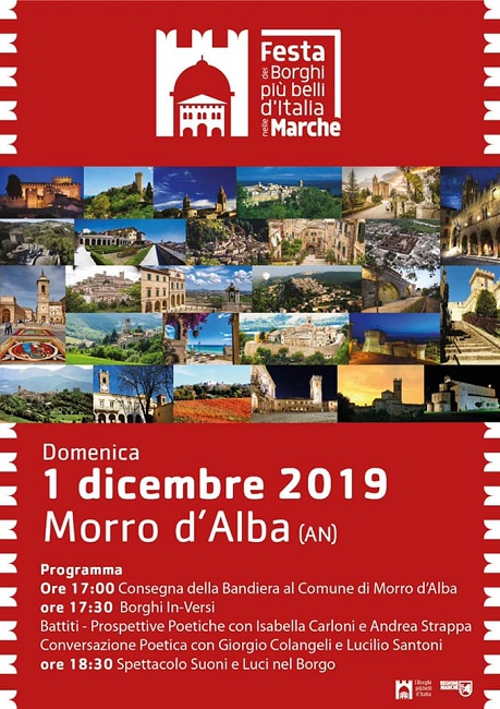 In un secondo momento assisteremo ad una “Conversazione poetica” con l’attore Giorgio Colangeli e Lucilio Santoni. Conclusa questa parte, alle 18.30 circa, in piazza Romagnoli, abbracciati dalle imponenti mura castellane, nel cuore del Borgo di Morro d’Alba, assisteremo al suggestivo spettacolo Suoni e Luci nel Borgo. Il videomapping progettato e realizzato per questa speciale occasione dall’artista Mirco Rinaldi, verrà proiettato sulla settecentesca facciata della Chiesa di San Gaudenzio, un evento che vuole raccontare e celebrare al contempo un territorio, il borgo di Morro d’Alba e la sua comunità che emerge dal passato per proiettarsi con l’orgoglio della sua identità in un entusiasmante futuro. I Borghi più belli d’Italia nelle Marche, in questa prima domenica di dicembre, celebrano la loro Festa e danno così l’avvio alle manifestazioni natalizie che illumineranno di calde emozioni tutta la nostra straordinaria regione