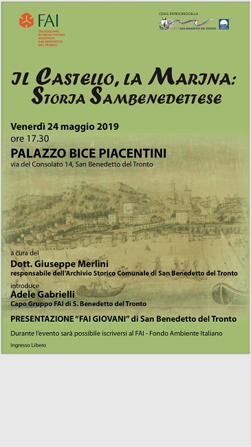 SAN BENEDETTO – Venerdì 24 maggio, alle ore 17.30 si terrà presso il Palazzo Bice Picentini l’incontro, promosso dal Gruppo FAI di San Benedetto del Tronto – Delegazione di Ascoli Piceno, dal titolo: “Il Castello, la Marina: Storia Sambenedettese”.