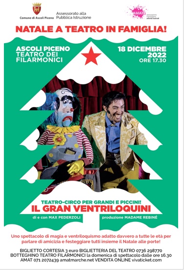 ASCOLI PICENO – Domenica 18 dicembre 2022 al Teatro dei Filarmonici di Ascoli Piceno va in scena uno spettacolo dedicato a tutta la famiglia, promosso dall’Assessorato alla Pubblica Istruzione del Comune di Ascoli Piceno con l’AMAT. L’appuntamento è con Il Gran Ventriloquini, spettacolo di teatro – circo per grandi e piccini con magia e ventriloquismo per parlare di amicizia e festeggiare tutti insieme il Natale alle porte.