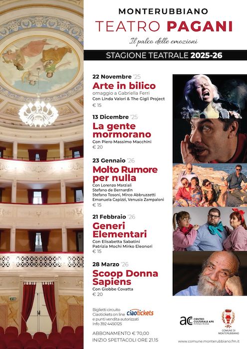 MONTERUBBIANO (FM) – Al via “Il palco delle emozioni”, la nuova stagione al Teatro Pagani di Monterubbiano, autentico gioiello architettonico e cuore culturale del territorio. Il cartellone 2025/2026 propone un percorso di grandi artisti che porteranno sul palco prosa, musica e comicità, pensato per offrire un teatro accessibile e coinvolgente, aperto a pubblici diversi e capace di unire linguaggi e sensibilità confermando il teatro come spazio di partecipazione, dialogo e crescita collettiva.