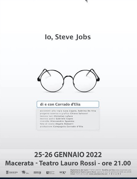 Io, Steve Jobs è uno spettacolo di e con Corrado D’Elia. selezionato nell’ambito di Next 2020 un progetto di Regione Lombardia in collaborazione con Fondazione Cariplo. Il progetto scenico è di Chiara Salvucci, assistenti alla regia Luca Ligato e Sabrina De Vita, ricerca Alessandro Sgamma, produzione Compagnia Corrado d’Elia.