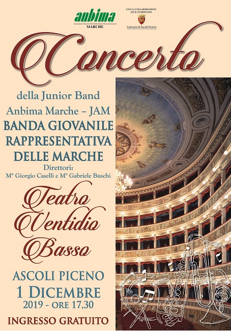 ASCOLI PICENO – Il 1 dicembre 2019 alle ore 17.30 al Teatro Ventidio Basso di Ascoli Piceno si terrà il concerto tenuto dalla Banda Giovanile Rappresentativa delle Marche denominata JAM, Junior band Anbima Marche che è sorta tre anni fa dai corsi di aggiornamento per giovani musicisti delle bande musicali marchigiane.