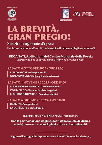 L’Associazione Beniamino Gigli, nel periodo ottobre-dicembre, ripropone delle Selezioni ragionate d’opera per la preparazione all’ascolto delle stagioni liriche. Il titolo della rassegna è La brevità gran pregio!