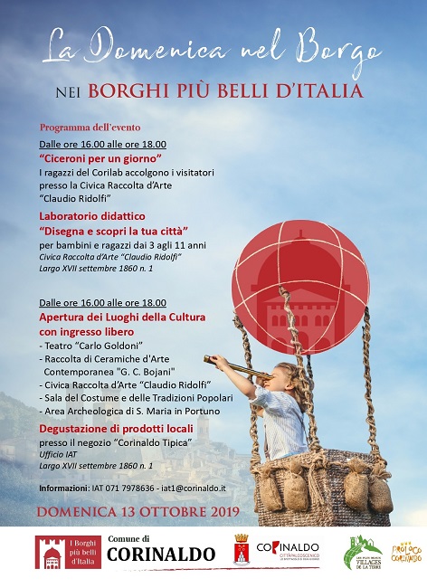 CORINALDO – Domenica 13 ottobre, i Borghi più Belli d’Italia, associazione nata nel 2001 e della quale il Comune di Corinaldo fa parte, apriranno le loro porte per accogliere i visitatori nei centri storici, musei, chiese, palazzi e monumenti e svelare ognuno il proprio patrimonio storico, artistico, culturale. Guide d’eccezione saranno i ragazzi delle scuole: i “Ciceroni per un giorno”. Atmosfere, odori e sapori che rendono i Borghi più belli d’Italia un modello di vita che vale la pena gustare.