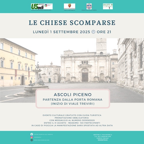 La prenotazione all’iniziativa dedicata alla chiese scomparse di Ascoli Piceno va effettuata entro il 31 agosto, inviando un messaggio al numero 393 9365509 con nome e cognome.