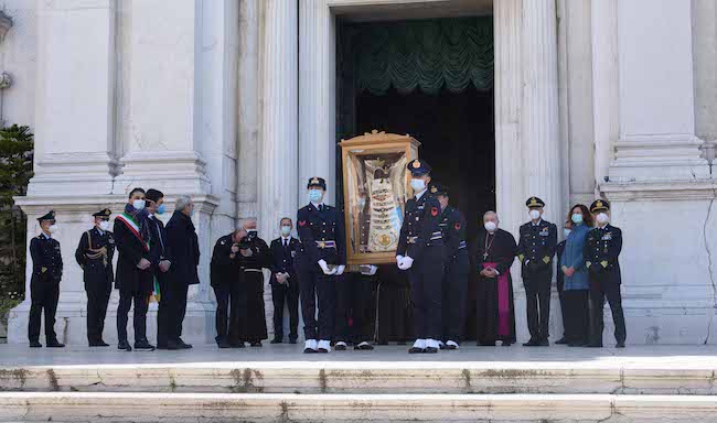 Inoltre, a testimoniare lo spirito dell’Aeronautica Militare ad operare nella dimensione aerospaziale, il Generale Fantuzzi ha consegnato l’effige, realizzata sempre in occasione del Giubileo Lauretano, che il Colonnello Luca Parmitano ha portato con se nel corso dell’ultima missione sulla Stazione Spaziale Internazionale (ISS).