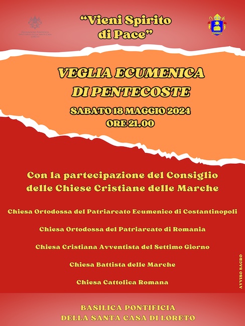 LORETO – Il Santuario Pontificio della Santa Casa di Loreto comunica che sabato 18 maggio alle ore 21.00 si celebrerà la Veglia di Pentecoste nella Basilica Pontificia della Santa Casa di Loreto.