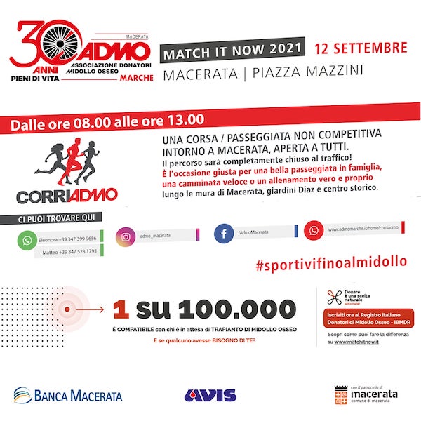 MACERATA – In occasione di “Match it Now”, l’evento nazionale dedicato alla donazione del midollo osseo e delle cellule staminali emopoietiche promosso dal Ministero della Salute, Centro nazionale trapianti, Centro nazionale Sangue, Registro Italiano Donatori di Midollo Osseo, dalle Federazioni ADMO e ADOCES e dall’associazione disco, domenica 12 settembre 2021 torna a Macerata CorriADMO.