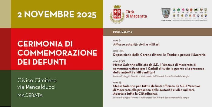 MACERATA – A Macerata, domenica 2 novembre, presso il civico cimitero, si terranno le cerimonie di commemorazione in ricordo dei caduti di tutte le guerre e dei defunti.