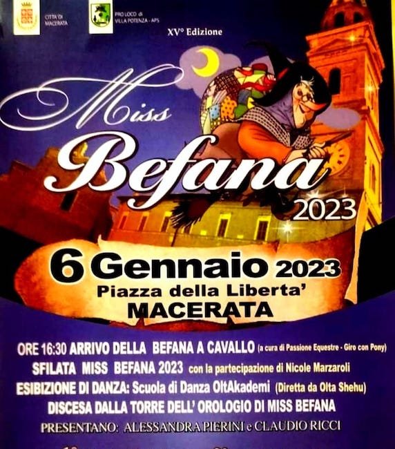 “La Pro loco di Villa Potenza è orgogliosa di poter tornare nella magnifica piazza della Libertà per l’evento Miss Befana e dare vita a un momento di aggregazione e felicità per bambini, genitori e nonni – ha aggiunto Giuseppe Luzi, presidente della Pro loco di Villa Potenza -. Per un pomeriggio torneremo tutti bambini dimenticando, anche solo per un attimo, le cose brutte dell’anno passato per lasciare spazio alla condivisione e alla festa”.
