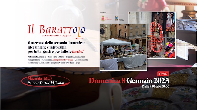 MACERATA – Domenica 8 Gennaio 2023, dalle ore 9.00 alle 20.00, torna “Il Barattolo”, il mercato per hobbisti che dal 1996 si svolge la seconda domenica del mese nelle splendide piazze cinquecentesche e nei Portici del Centro Storico di Macerata . Una intera giornata interamente dedicata ad Artigianato Artistico e Vero Fatto a Mano, Abbigliamento Vintage e Accessori introvabili, Bigiotteria, Collezionismo, Modernariato, Hobbistica, Libri, Musica, Film, CD, DVD & Games, Dischi in Vinile.Si potrà curiosare fra i banchi e trovare l’oggetto inaspettato che si cercava in un atmosfera di relax tra migliaia di pezzi unici e introvabili, del presente e del passato.
