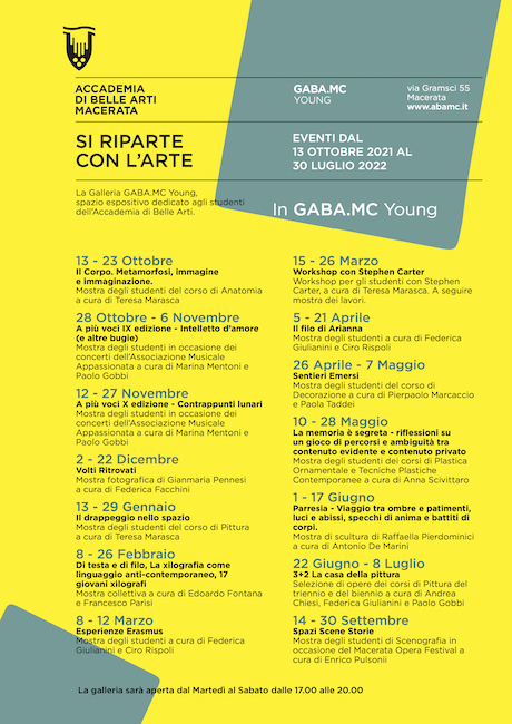 MACERATA – L’Accademia di Belle Arti di Macerata è lieta di annunciare la nuova programmazione della Galleria GABA.MC Young per l’anno accademico 2021/2022.