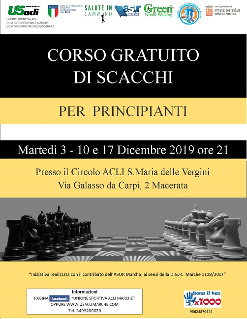 MACERATA – Prenderà il via martedì 3 dicembre, alle ore 21, un corso gratuito di scacchi per principianti.
