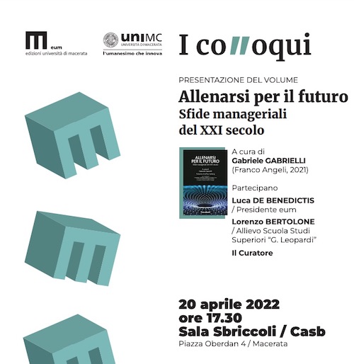 MACERATA – Nell’ambito dei Colloqui eum, mercoledì 20 aprile alle 17.30 la casa editrice dell’Università di Macerata presenta il libro “Allenarsi per il futuro. Sfide manageriali del XXI secolo”, a cura di Gabriele Gabrielli (Franco Angeli, 2021). Con il curatore, docente dell’Università Luss “Guido Carli”, parteciperanno Luca De Benedictis, presidente Eum, e Lorenzo Bertolone, allievo della Scuola di Studi Superiori “Giacomo Leopardi”. L’incontro si terrà nella Sala Sbriccoli del Casb ( Biblioteca di Ateneo) in Piazza Oberdan, 4, Macerata.