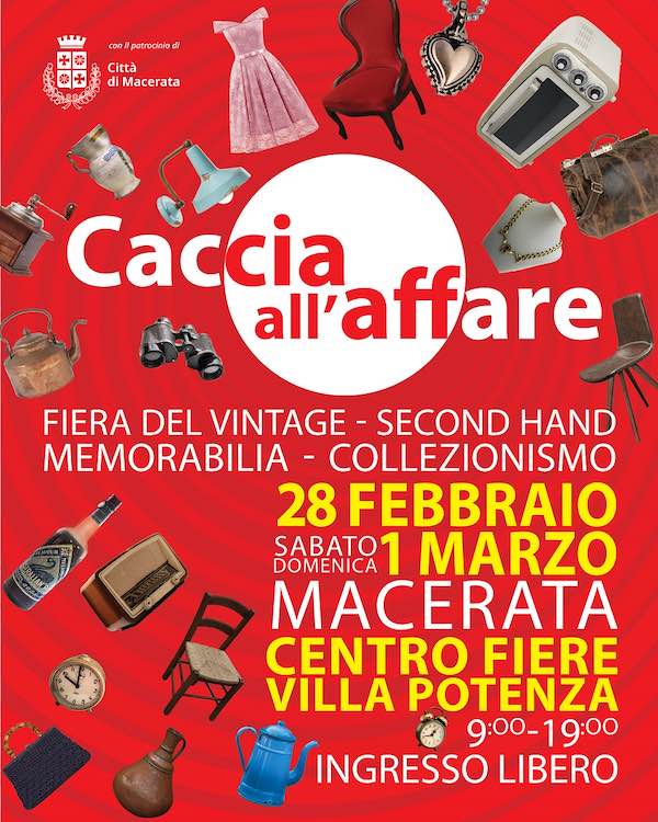 MACERATA – La terza edizione del mercatino Caccia all’Affare si riconferma come un appuntamento molto atteso nel panorama dei mercati del vintage e dell’antiquariato. Con il patrocinio del Comune di Macerata, la prossima edizione si svolgerà il 28 febbraio e primo marzo negli spazi al coperto del centro fieristico di Villa Potenza.