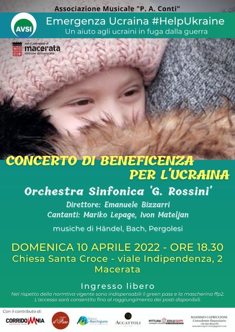MACERATA – L’Associazione Musicale Pier Alberto Conti, realtà culturale costituitasi a Civitanova Marche più di 30 anni fa e riferimento sul territorio per proposte di musica classica, e la rete sostenitori locali di AVSI, associazione non profit, che opera in numerosi paesi con progetti di cooperazione allo sviluppo e aiuto umanitario, organizzano un concerto di beneficenza, patrocinato dal Comune di Macerata, a sostegno dell’impegno di operatori e volontari nella assistenza di profughi ucraini che hanno raggiunto o stanno raggiungendo l’Italia e di profughi presenti nelle zone di confine in Polonia, Romania, Ucraina e Moldavia.