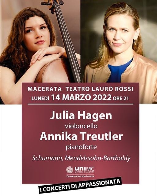 MACERATA – L’estro intenso e il fascino espressivo dello Schumann pianistico e l’alternanza, ricca di trascinante vitalità, fra irruenza e intimismo di Mendelssohn-Bartholdy rivivono nell’interpretazione di due fenomenali musiciste, la violoncellista Julia Hagen e la pianista Annika Treutler, in concerto lunedì 14 marzo alle ore 21 al Teatro Lauro Rossi per la stagione di Appassionata.