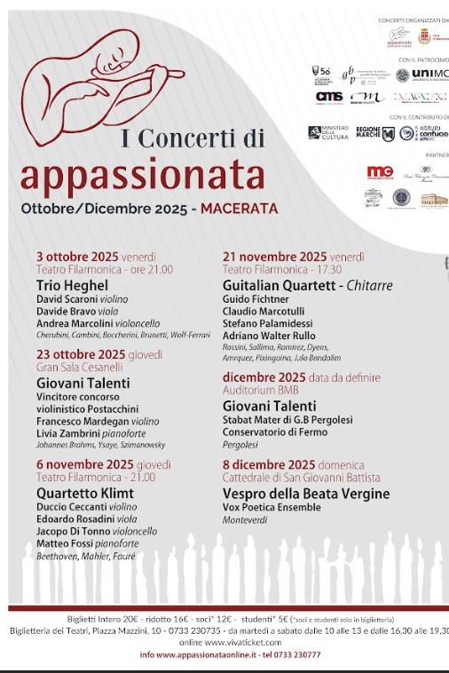 MACERATA – Riparte venerdì 3 ottobre alle 21 al Teatro della Filarmonica la stagione dei concerti di Appassionata, con un cartellone che intreccia tradizione, innovazione e giovani talenti, in un percorso musicale coerente e appassionante. Il filo conduttore della stagione si snoda dalla musica italiana del Sette-Otto-Novecento fino ai capolavori della musica sacra, offrendo al pubblico un viaggio attraverso epoche, stili e sensibilità diverse.