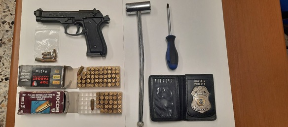 Acquisiti tutti gli elementi necessari al prosieguo dell’attività investigativa, nella giornata di ieri si è chiusa la rete intorno ai due malviventi. L’operazione è scattata nel pomeriggio davanti ad un bar sito in una zona semicentrale di Macerata, dove i due complici avevano dato l’appuntamento alla vittima per la consegna della somma di denaro dovuta consistente in alcune migliaia di euro. La consegna veniva seguita visivamente dai poliziotti che intervenivano immediatamente traendo in arresto i due malviventi prima che gli stessi riuscissero a compiere una qualsiasi manovra. La perquisizione condotta sull’autovettura con la quale i due erano giunti sul posto consentiva di rinvenire: la pistola con la quale la vittima era stata minacciata, risultata essere una scacciacani, identica per forma a quelle in uso alle Forze di Polizia occultata nel sedile lato guida, un coltello lungo 32 cm, alcune cartucce calibro 9 x 21, un porta-distintivo con placca in metallo con scritta “Polizia Privata”, un cacciavite, un’asta in metallo e un telefono cellulare.