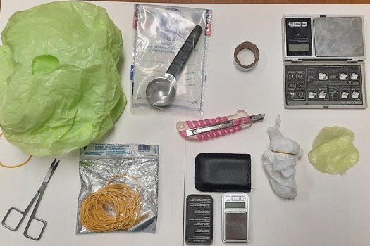 Veniva inoltre rinvenuto vario materiale, solitamente utilizzato dagli spacciatori per il confezionamento di sostanza stupefacente tra cui dosatori, forbici, due bilancini elettronici di precisione e ritagli di cellophane.