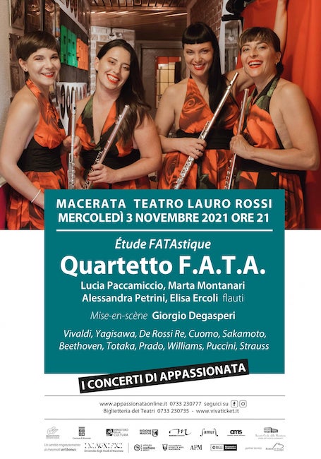 MACERATA – Mercoledì 3 novembre 2021, alle ore 21.00, al Teatro Lauro Rossi il Quartetto F.A.T.A. va in scena con “Étude FATAstique” per i Concerti di Appassionata. Sodalizio artistico tutto al femminile composto da Lucia Paccamiccio, Marta Montanari, Alessandra Petrini e Elisa Ercoli, il Quartetto F.A.T.A. (Fuoco-Acqua-Terra-Aria) propone un concerto s-concertante, divertente, ironico e surreale che vede le flautiste marchigiane nella doppia veste di musiciste e attrici, su un’originale regia di Giorgio Degasperi.