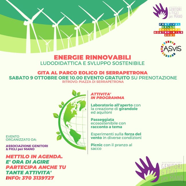 È di fondamentale importanza che l’Agenda 2030 per lo sviluppo sostenibile viene fatta propria dalle famiglie e dai bambini e le bambine. Scegliendo Goal 7 – Energia pulita e accessibile – l’associazione “GENITORI&FIGLI, per mano” ODV organizza per sabato 9 ottobre 2021 l’evento gratuito dove si toccherà con la mano il concetto di energia così astratto per i piccoli. Viene scelto l’esempio del vento come energia rinnovabile ed ecosostenibile illustrato nello spettacolare scenario del parco eolico Villa d’Aria sopra Serrapetrona(MC).