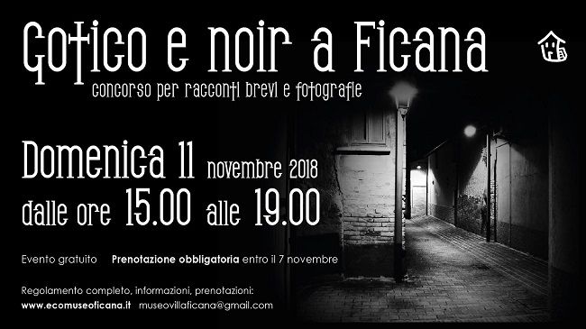 Domenica 11 novembre invece il pomeriggio all’Ecomuseo sarà dedicato al Concorso per fotografie e racconti brevi “Gotico e Noir a Ficana”: dalle 15 alle 19 ci si potrà ritrovare in un luogo ricco di suggestioni, Villa Ficana, per scrivere e fotografare il borgo nelle sue atmosfere “Noir”, seguendo il corso dei secoli e ambientando scritti e fotografie in anni ed epoche definite dalla loro storia e dalle loro peculiarità.
