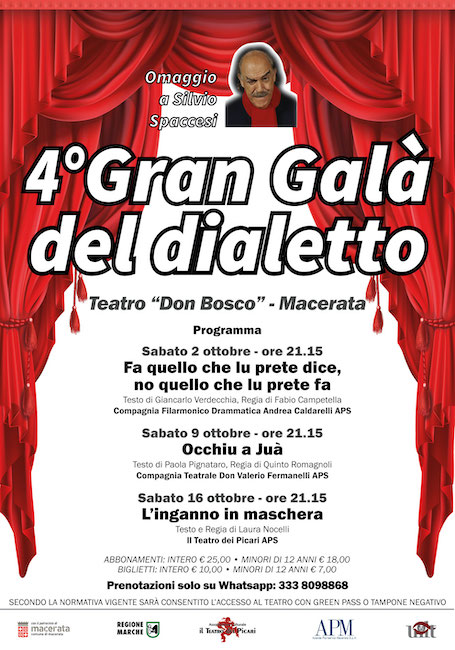MACERATA – In scena dal 2 al 16 ottobre 2021 al Teatro Don Bosco di Macerata la quarta edizione del “Gran Galà del Dialetto” organizzata da “Il Teatro dei Picari APS”, sostenuta dalla UILT Marche con il patrocinio del Comune di Macerata.