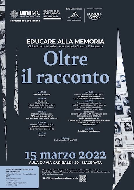 Dopo i saluti istituzionali e l’intervento di Mario Venezia, sarà la volta delle docenti Unimc Stefania Zezza, che parlerà di ermeneutica della testimonianza, Silvia Pierosara, che introdurrà il tema dell’etica narrativa e della memoria, e Maria Paola Scialdone su come sopravvivere alla Shoah, memoria, oblio e mnemonica.
