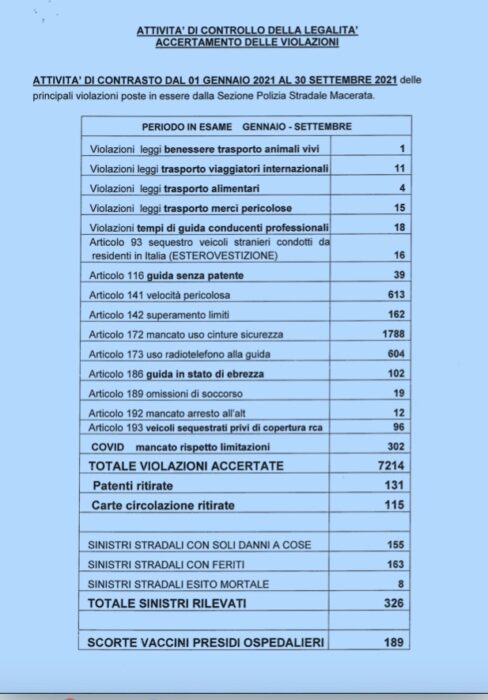 L’attività di cui sopra, sintetizzata nell’allegato prospetto contenente i dati relativi ai risultati conseguiti dal 1° gennaio al 30 settembre 2021, scaturisce dall’implementazione dei servizi di controllo del territorio previsti da mirate Ordinanze del Questore, anche da parte delle specialità della Polizia.