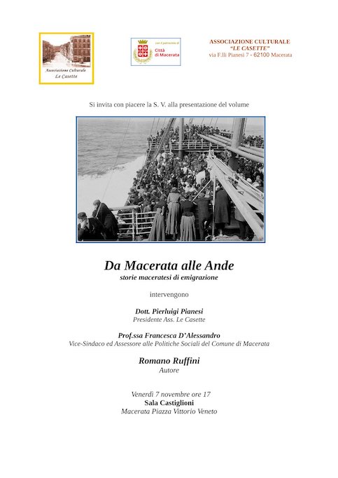MACERATA – L’Associazione Culturale Le Casette di Macerata, con il patrocinio del Comune, presenta un nuovo lavoro editoriale: Da Macerata alle Ande: storie maceratesi di emigrazione.