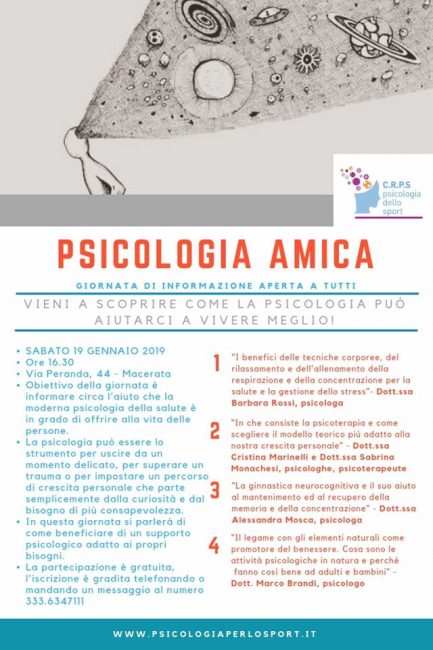 MACERATA – Informare sull’aiuto che la moderna psicologia della salute è in grado di offrire alla vita delle persone. E’ questo l’obiettivo della giornata di informazione, aperta a tutti, “Psicologia amica” organizzata dal Centro Regionale di Psicologia dello Sport che si terrà sabato 19 gennaio, dalle ore 16,30, nella sede di via Peranda, 44 a Sforzacosta.