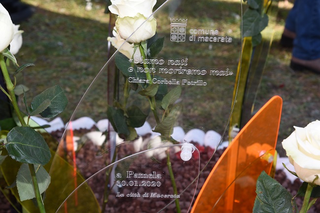 “Il tempo sedimenta la memoria ” ha detto il sindaco Romano Carancini “ed è anche la dimensione giusta per scegliere il segno che la mantenga viva. Oggi in questo giardino e in questa bellissima cornice composta da amministratori, autorità e tanti cittadini, Macerata pone il terzo segno per onorare la memoria di Pamela. Il primo fu il corteo contro tutte le forme di violenza e razzismo che due anni fa attraversò una città attonita. Il secondo, lo scorso anno, con la sua commemorazione in Consiglio comunale. Ed oggi sono questi fiori stilizzati di tutti i colori e una dedica che inneggia alla vita a testimoniare la memoria della città, un segno che invita alla speranza. In questo giardino verranno i bambini, le famiglie, sarà un posto che racconterà la gioia per non cedere alla cultura della morte e della violenza”.