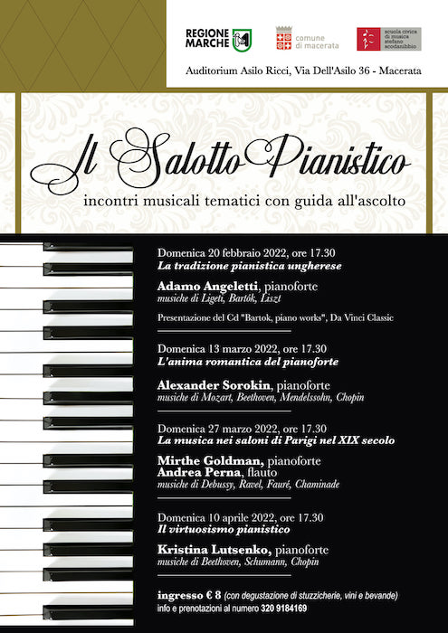 Il 20 febbraio protagonisti saranno “La tradizione pianistica ungherese” e Adamo Angeletti al pianoforte che eseguirà musiche di Ligeti, Bartok e Liszt, il 13 marzo sarà la volta de “L’anima romantica del pianoforte” con Alexander Sorokin al pianoforte e musiche di Mozart, Beethoven, Meldelssohn e Chopin.