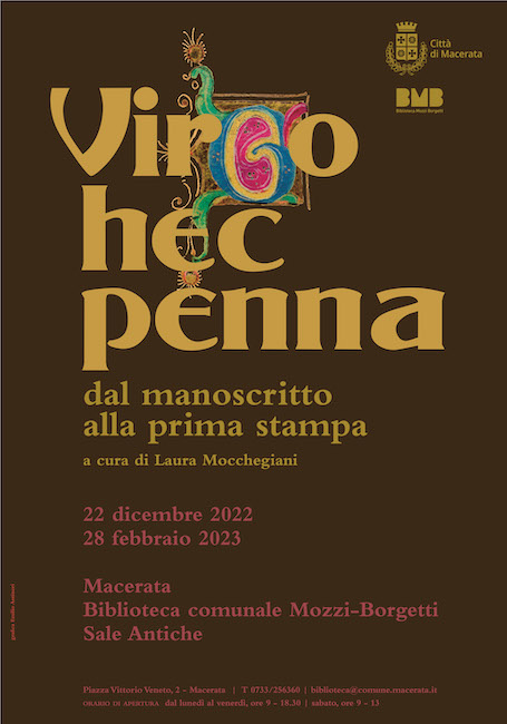 MACERATA – Verrà inaugurata oggi, giovedì 22 dicembre, alle ore 17.00, nelle sale antiche dalla biblioteca Mozzi Borgetti la mostra “Virgo hec penna. Dal manoscritto alla prima stampa”.