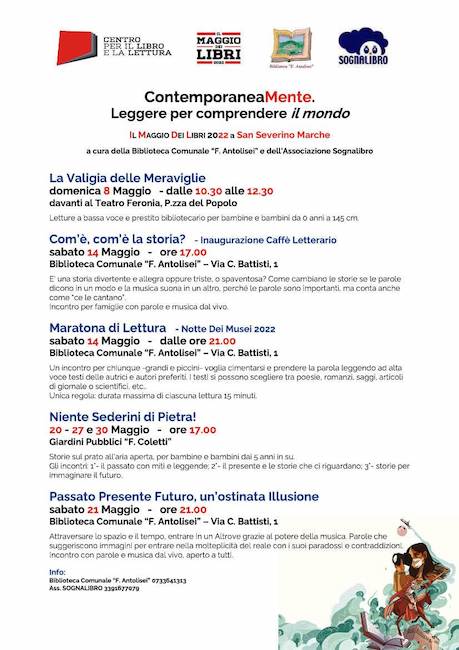 SAN SEVERINO MARCHE – La Biblioteca comunale “Francesco Antolisei” di San Severino Marche, in collaborazione con l’associazione Sognalibro, propone il “Maggio dei libri”.